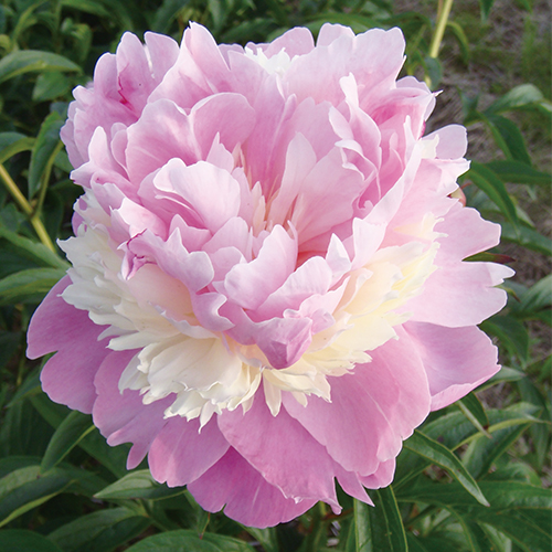 外側はライトピンク中間はクリーム色、中心はピンクの三段咲の可愛い咲形が特徴的で栽培もしやすい中生咲。ボタン科
