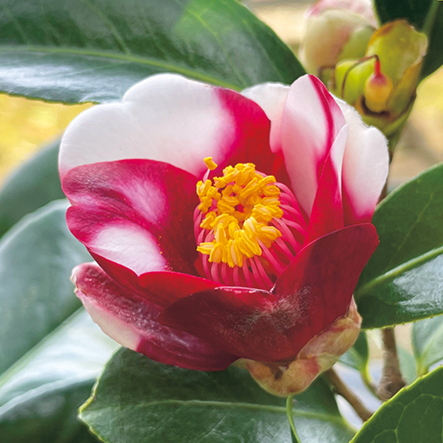 紫色を含む濃紅の花弁に純白が美しく混じりあう。葉は小ぶりで枝のもやや細くすっきりとした印象の木姿。花付きよく、生長緩やかでコンパクトに育ち盆栽にも向く。ツバキ科