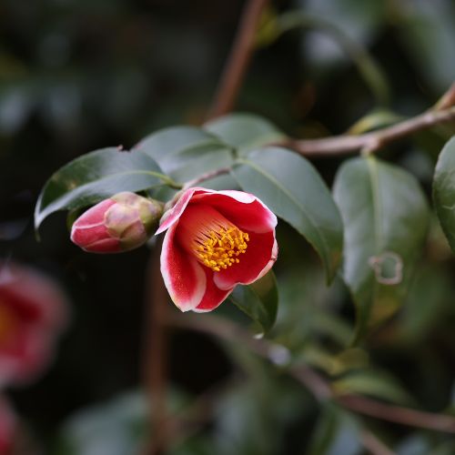 長崎県五島列島原産、日本を代表する名花。細く広がる枝先に小ぶりながらはっきりとした濃淡の花が咲いた姿は無二の魅力がある。ツバキ科