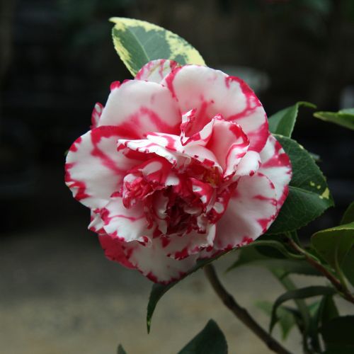 獅子咲き~牡丹咲きの中では希少な秋咲き品種。赤と白の割合や混ざり方は花によって異なり、開花時期の数か月間様々な花姿が楽しめる。ツバキ科