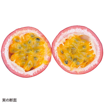 「クダモノトケイソウ」の名でも知られ、独特の花も美しい。甘酸っぱいゼリー質の実をタネごと食べる。収穫後は追熟させ、果皮にしわが寄ってきたら食べ頃。トケイソウ科