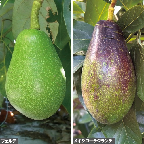 | 【商品情報】 | ■メキシコーラグランデ 果皮は黒色で光沢がありアボカドでは耐寒性が特に強い。 開花型:A型 ■フェルテ 緑皮種。耐寒性と結実性がよく、大実。 開花型:B型 |