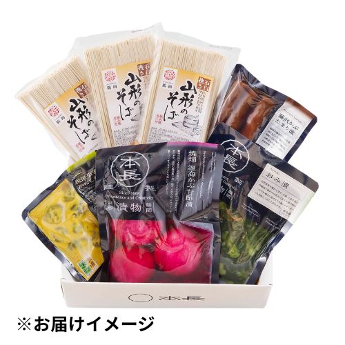■内容量: ①山形新そば200g×3袋 ②民田茄子からし漬100g×1袋 ③温海かぶ甘酢漬200g×1袋 ④おみ漬150g×1袋 ⑤藤沢かぶたまり漬100g×1袋