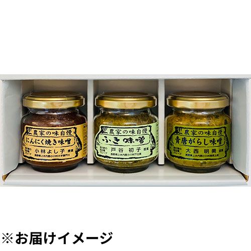 ■内容量:(1)にんにく焼き味噌、(2)ふき味噌、(3)青とうがらし味噌 各90g×1本 計3本