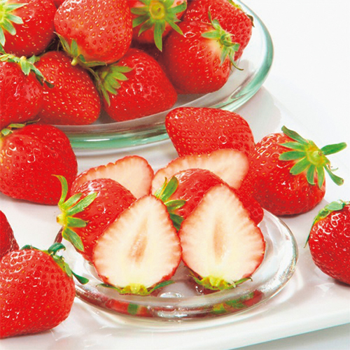 まるまるとしたかわいらしい形が特徴。甘みの中に程よい酸味と、深みのある豊かな香りが特徴です。イチゴの甘みはヘタ側より先端の方が強いため、ヘタ側から食べることで甘さを程よく楽しめます。