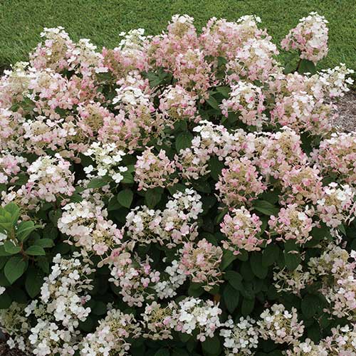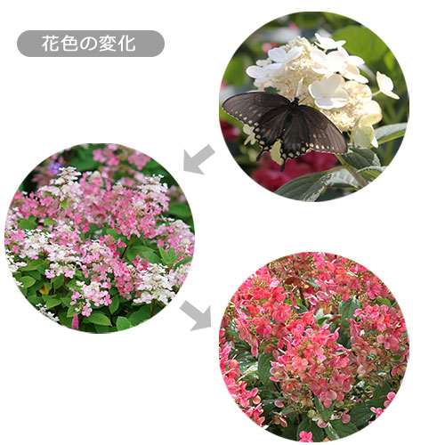 花色は白・ピンク・赤紫に変化。色変化が楽しめる。株を覆うように密に咲く。新枝咲きのため、剪定期を選ばない。通常のアジサイと違い、夏の選定の必要がない。プランターでも楽しめるコンパクトなノリウツギ。アジサイ科