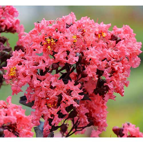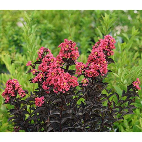 コーラル色花。ツヤのある黒葉のサルスベリ。花色とのコントラストが美しい。耐病性が改良され、分枝性が高く、コンパクト。リーフとしての観賞価値が高い。耐暑性・耐寒性ともに優れる。ミソハギ科