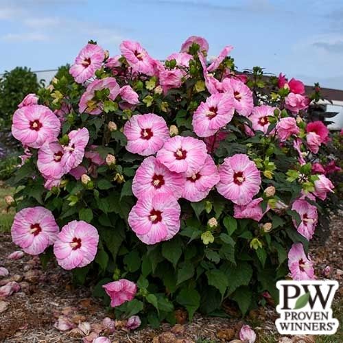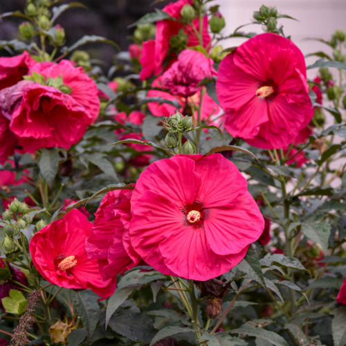 約マイナス30度まで耐えるハイブリッド宿根ハイビスカス。耐暑性も高く、強健。生育旺盛で大きな株に育つ。ボリュームのあるこんもりとした樹形は植栽のアクセントに。ローズ色花。アオイ科