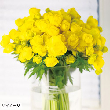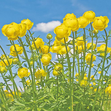 従来品種に比べ、草丈は半分ほどでコンパクトにまとまり、大輪で花つきのよい点も魅力。丸みのある鮮黄色花が愛らしい。重なり合う花弁が球のように咲くトロリウス・ユーロパエウス(玉咲キンバイソウ)のわい性品種。キンポウゲ科