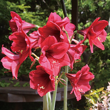 濃い赤花を咲かせる中輪・中型種。鉢栽培向きで霜の当たらないところで越冬させる。通称「アマリリス」。春と秋は生育旺盛なので水をよくやり、真夏と真冬は半休眠するので水を控えるのがポイント。ヒガンバナ科