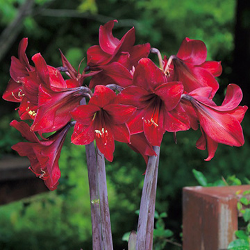光沢のあるベルベット調の花色が美しい。通称「アマリリス」。春と秋は生育旺盛なので水をよくやり、真夏と真冬は半休眠するので水を控えるのがポイント。ヒガンバナ科