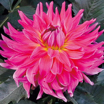 濃桃色から黄色へのグラデーションが美しい大輪種。花姿はボリュームがあり豪華、茎は太く頑強で育てやすい。キク科
