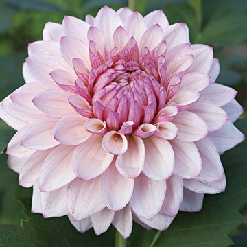 表が白く裏が淡紫色の花弁で落ち着いたおしゃれな印象。フォーマルデコラ咲きの中輪。茎は中太で強く育てやすい。キク科