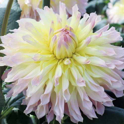 クリーム色地で弁先が桃色の優しく柔らかな花色が美しい巨大輪種。草性は太く頑強。草丈は低めにまとまり育てやすい。キク科
