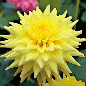 黄一色のセミカクタス咲きで、星のような花姿。草性は中太で花首が強く、理想的な開花角度で咲く。キク科