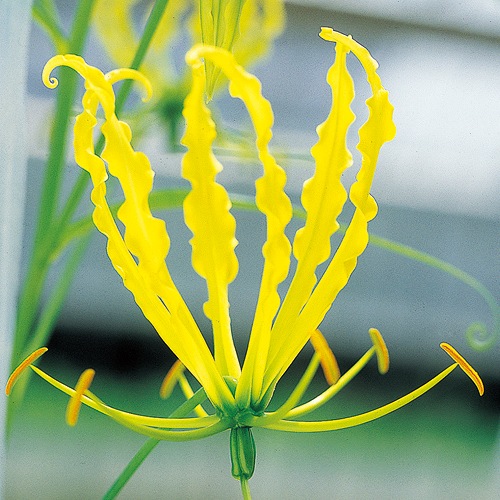 黄色の細弁花で多花性。個性的な色や形で生け花や切り花に人気。葉の先の巻きひげで物につかまって伸びる半つる性植物で別名「クライミングリリー」。熱帯性のため冬は球根を掘り上げて管理。イヌサフラン科