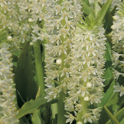 単色の白花でユーコミスの中では珍しい。中型~大型の品種で地植えでも鉢植えでも育てやすく、切り花にも向く。南アフリカ原産。小花が穂状につき、さらに頂上に葉を生じパイナップルに似たおもしろい花穂になる。キジカクシ科