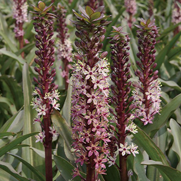 ローズピンクの宝石が輝くような美しい花色のパイナップルリリー。中型の品種で、美しい葉色も魅力的。南アフリカ原産。小花が穂状につき、さらに頂上に葉を生じパイナップルに似たおもしろい花穂になる。キジカクシ科