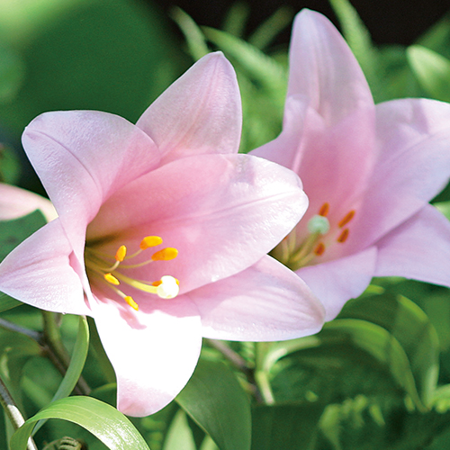 テッポウユリ交配種。甘い香りが楽しめる、ヒメサユリを思わせる淡桃色花が可憐。ユリ科
