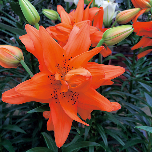 AHユリ。八重咲きのオニユリを思い浮かべるすかしの橙色花の八重種。草丈が伸びやすく、輪つきがとてもよい。ユリ科
