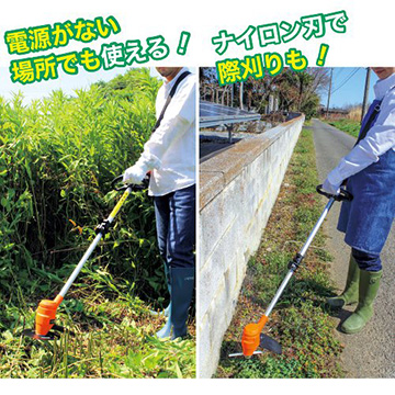 フル充電で約35分稼働!刃は金属刃と、際刈りに適したナイロン刃の2種類あるので、用途に合わせて使い分け可能。ポール長さ、ハンドル位置は調節可能です。最短1mとコンパクトに収納でき、コードレスなので持ち運び、メンテナンス、刃の交換も簡単です。(製造:中国 企画:アメリカ)