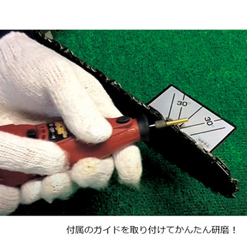 山奥でも、チェーンソーが切れ味悪くなったと思った時に、すぐに研磨ができ、作業続行できます。新品のアルカリ電池を使用した場合、約2時間と稼働時間も十分です。難しいチェーンソーの刃研ぎも、刃研ぎガイドを付けて軽く研磨するだけ。業者に依頼せずとも自分でチェーンソーの刃をメンテナンスでき、刃を交換するより経済的なのでおすすめです。(中国製)