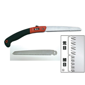 折込鋸変速刃に付いている荒目と細目の刃は、細目部分で切り出し、荒目部分で切断しますので、切り始めから滑らかな切れ味で、細枝・太枝の兼用切断にも便利です。竹切用替刃、共に切断能力は、直径約13.5cm。(日本製)