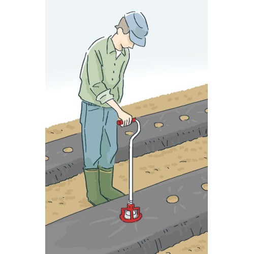 マルチ栽培やトンネルの温度調節、換気などの穴が簡単にあけられます。おさえ枠があるため、マルチのズレがなくキレイに穴があきます。刃は特殊ステンレス鋼仕上げのためサビの心配がなく、切れ味もよいです。(日本製)