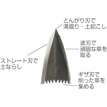 軽量のアルミ柄で、刃先はステンレス製のサビに強い三角鍬です。草削り、レーキ、土ならし、溝掘りなどの作業ができる優れものです。(日本製)