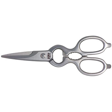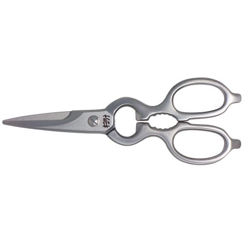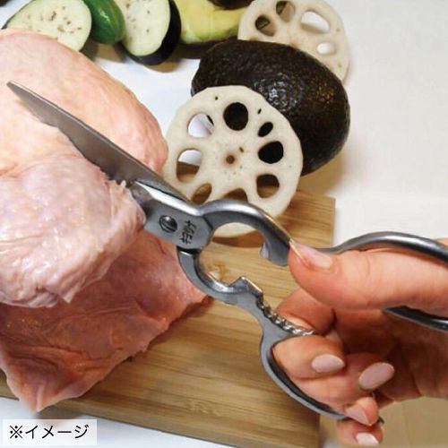 これを使えば主婦がシェフに変身?!それほどに片手でラクラク切れる鋏職人の技が光るキッチン専用鋏です。すばらしい切れ味のステンレス製の受け刃付鋏で、冷凍肉や骨付肉など硬いものから、バナナなどやわらかいものまで、滑らず狙った所を気持ちよくカットできます。オールステンレス全身鍛造で丈夫、清潔、切れ味長もち。さらに栓抜き、蓋開け、クルミ割り機能も兼ね備えます。(日本製)