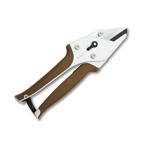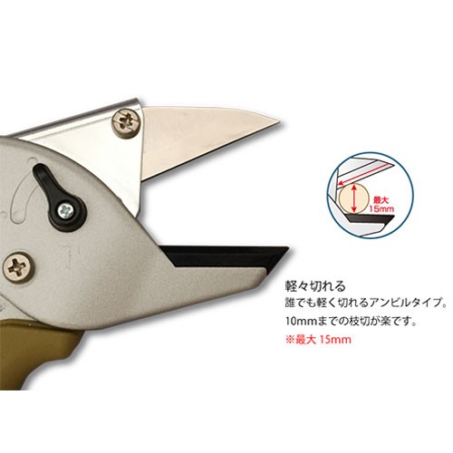 どなたでも軽く切れるアンビルタイプです。10mmまでの枝切りが楽にでき、最大15mmまで切断可能な剪定鋏です。腱鞘炎になりにくく、手への振動がより少ないアンビル型を採用。受け刃が樹脂なのでさらに衝撃を緩和します。刃は独自特許(特許第5547700号)を取得した背金を使用した替刃交換ができ、メンテナンス不要で楽に作業ができます。(日本製)