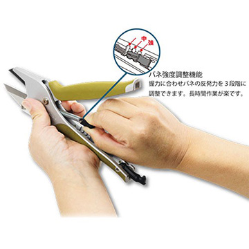 材質:[本体]アルミダイカスト、[グリップ樹脂】エラストマ樹脂、[その他樹脂パーツ】PA(ガラス繊維入り)、[引きばね]SWP-B(ばね鍋)、メッキ(三価クロメート)、[切り刃]SK-5、無電解ニッケルメッキ