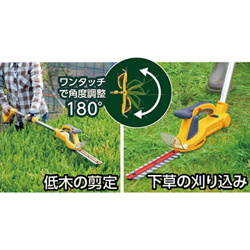 1台でポール式バリカンとハンディバリカンの2役をこなします。ポール式で使う場合は、バリカンの角度をワンタッチで180度調整できるので、高所はもちろん、草刈りから生け垣の剪定まで使いやすい角度に変えられます。手の届く範囲の剪定にはポールを取り外しハンディとして、狭い場所でも取り回しよく作業ができます。刃は切れ味がよく、さびにも強いハードクロムメッキ仕上げ。(中国製)