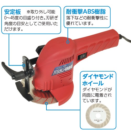 焼戻りの少ない低速回転モーター・使いやすいスリム形状+静音設計・刃研ぎ角の目安に「安定板」装着。(日本製)