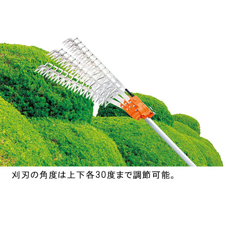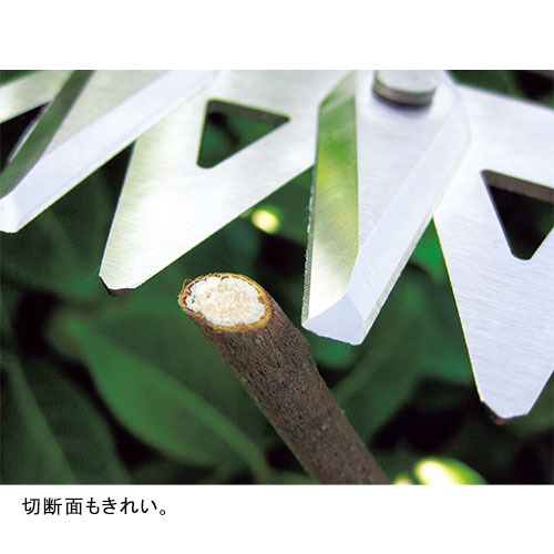 刈刃部にある12枚の刃がハサミのように動くので、切断時に樹木へのダメージが少ないです。高出力モーターが刃を毎分1270回ストロークさせ、直径15mmまでの生木が軽く切断できます。モーター安全装置付き。(日本製)