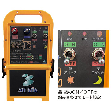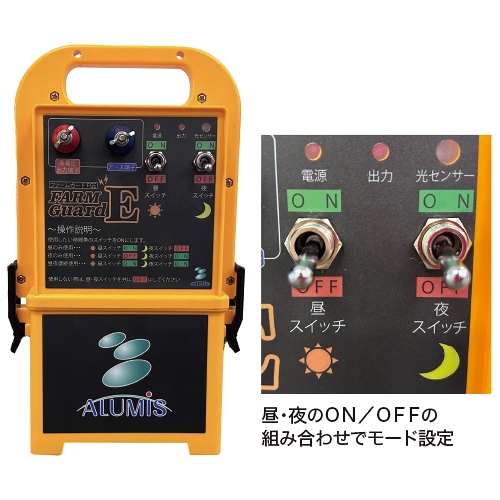 乾電池式電気柵で設置が簡単です。昼・夜スイッチのON/OFF組み合わせにより昼・夜・昼夜連続・切のいずれかのモード設定するので操作も簡単です。(中国製)