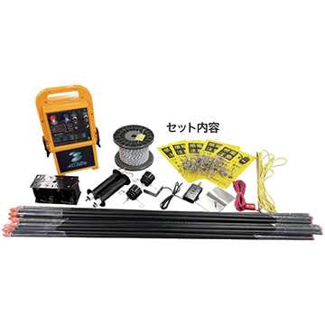 本体1台、FRP支柱(直径11mm×0.9M)25本、電気柵用クリップ50個、出力コード1本、ゲートセット2セット、ファームコード(200M巻)1巻、アース棒2連1本、テスター1個、危険表示板5枚、乾電池ボックス1個、本体取付金具(ネジ2本付き)1セット