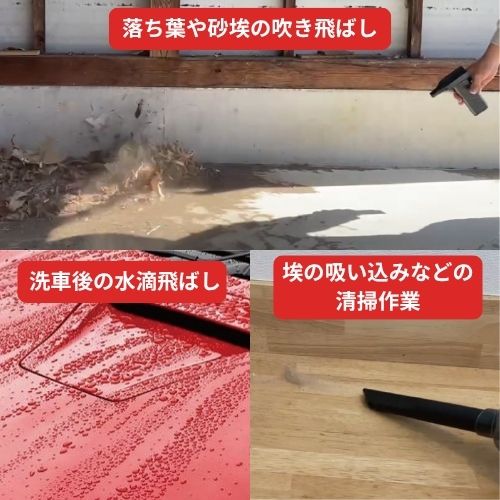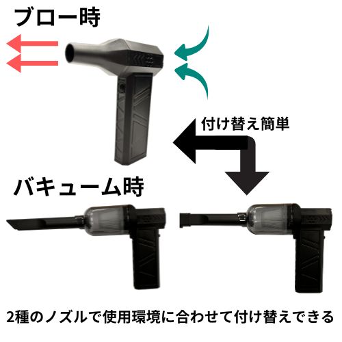 手持ちタイプでコンパクト仕様ながら、風速は驚異の52m/s。ノズルの付け替えで吹き飛ばし・集塵を両立した2way仕様の商品です。(中国製)
