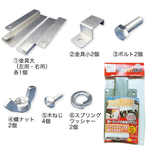 ■セット内容:金具大(左用・右用)各1個 金具小2個 ボルト2個 蝶ナット2個 木ねじ4個 スプリングワッシャー2個(1袋分)でアオリ部1カ所分なので、1台分(2袋)をセットにしてお届けします。