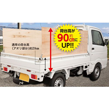本商品とコンパネ(12mm厚)を使用して、軽トラックの荷台の積載アップが可能に。コンパネに取り付け金具をビスで固定し、止め金具で軽トラックとコンパネを固定しアオリ部分が約90cmにアップ。(日本製)