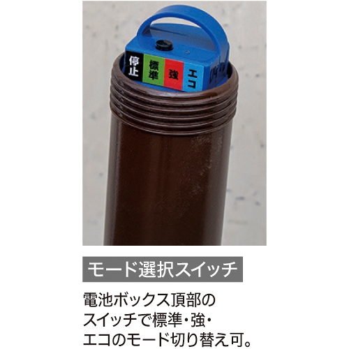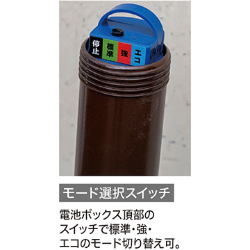 アルカリ乾電池単1形4個使用、電池寿命(約)標準モード:45日、強モード:17日、エコモード:85日