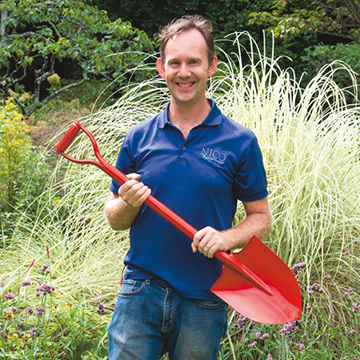 国産の頑丈なショベルを消防車のような「赤」でカラーリングしカッコイイ。ガーデナーのニコラス・レナハンさんも、お気に入り!(日本製)