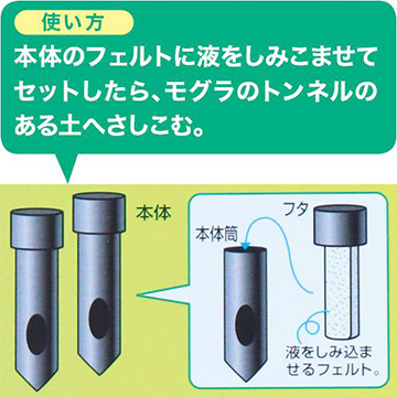 本体のフェルトに液をしみこませてセットしたら、モグラのトンネルのある土へさしこむ。