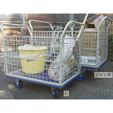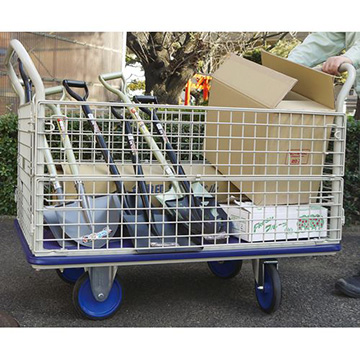 運搬、一時保管など効率的な作業に欠かせない、金網付のスチール台車です。金網付なので、長さのある荷物や積み重ねて多くの荷物を積載できます。金網は脱着式で、荷物を載せる台座部には、通常の鉄鋼よりも軽量で高強度のハイテン鋼を使用しています。またタイヤはクッション性・静寂性・耐候性に優れたブタジェンゴムを使用しています。500kgまでOK。(日本製)