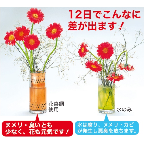 銅イオンの効果で水が活性化され、水が腐りにくく切り花が通常の約2倍長もちします。水のヌメリや臭いが抑えられるため水替えの回数が減らせます。お手持ちの花瓶の中に入れてご使用ください。(日本製)