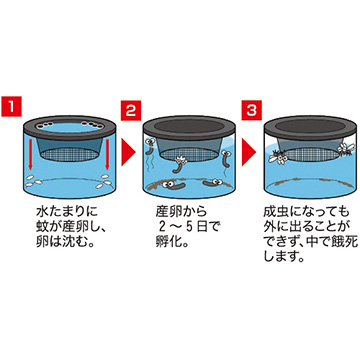 蚊の黒色を好む習性を利用し、容器内に産卵させます。卵は水中でふ化し、成長して蚊(成虫)になりますが、蚊は網目を通り抜けることが難しく、外へは逃げられないため容器内で死滅します。生活圏内に発生した蚊を都度駆除するのではなく、容器内で一度に多数の蚊を駆除することができるため、産卵するかを減らし、「いつの間にか蚊がいなくなる」効果を生み出します。