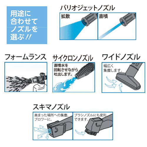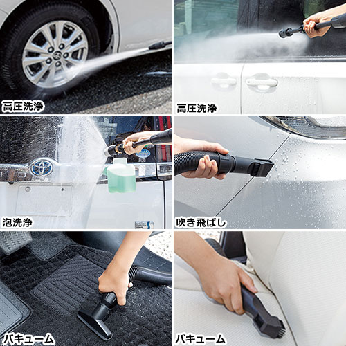 環境クリーニング機器の専門メーカー蔵王産業が家庭向けに開発。環境クリーニング専門メーカー視点で高圧洗浄機に便利な機能をプラス。ノズルを付け替えるだけで泡洗浄・バキューム・吹き飛ばしもでき効率よくお掃除できます。この1台だけで、洗車はもちろん、玄関・ベランダ掃除などにも大活躍です。パワフルながら女性一人でも持ち運べるサイズも魅力です。(中国製)