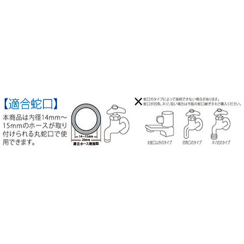 本商品は内径14mm~15mmのホースが取り付けられる丸蛇口で使用できます。
