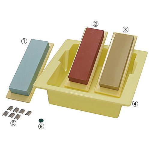■セット内容:(1)荒砥石:#220 (2)中砥石:#1000 (3)仕上砥石:#3000 (4)砥ぎ桶 (5)クリップ:7個(予備1) (6)桶滑止め:5個(予備1)