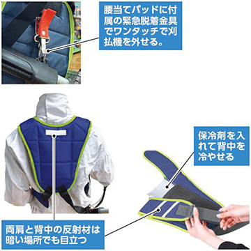 刈払機使用時に装着して、重さと振動を両肩に分散させるなど、身体への負担を軽減させます。背中内側ポケットには付属の保冷剤を入れられ、熱中症対策にも。(中国製)